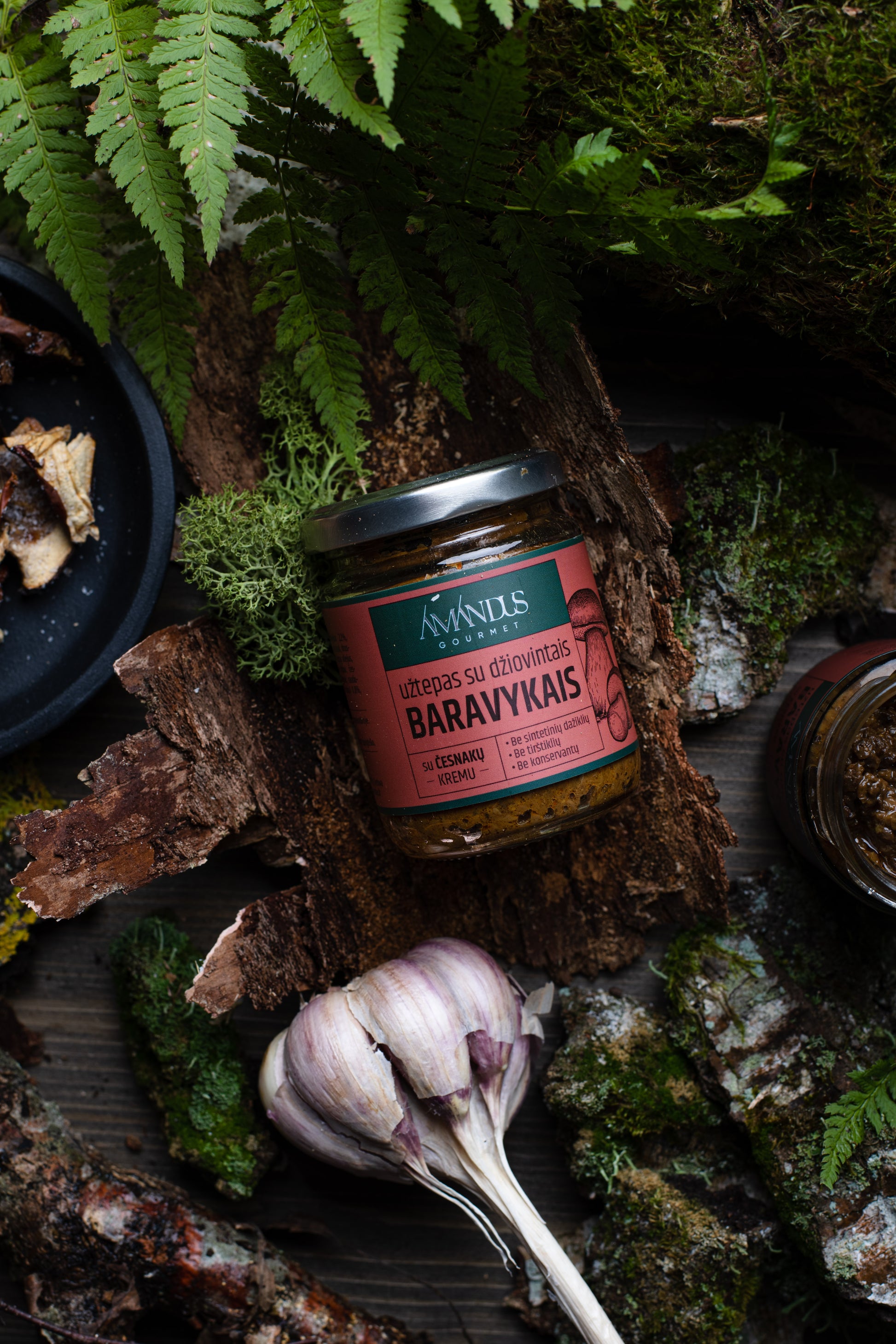 UŽTEPAS SU DŽIOVINTAIS BARAVYKAIS IR ČESNAKŲ KREMU